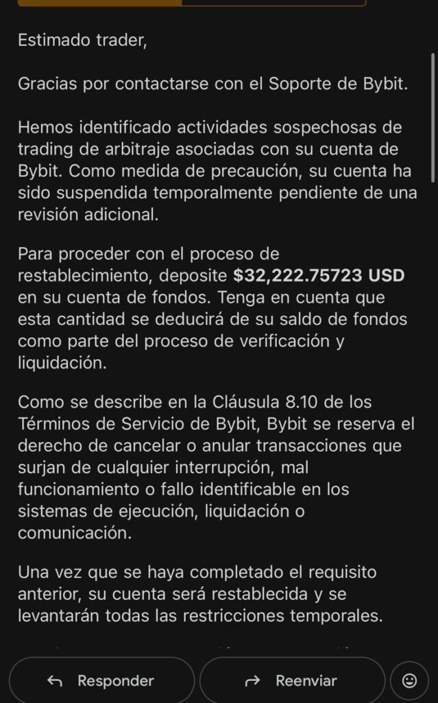 Bybit invocó la Cláusula 8.10 de sus Términos de Servicio, que permite anular trades por «interrupciones, mal funcionamiento o fallos en la ejecución». Los correos exigían depósitos en USD equivalentes a las «ganancias por arbitraje sospechoso» para «verificación y liquidación».