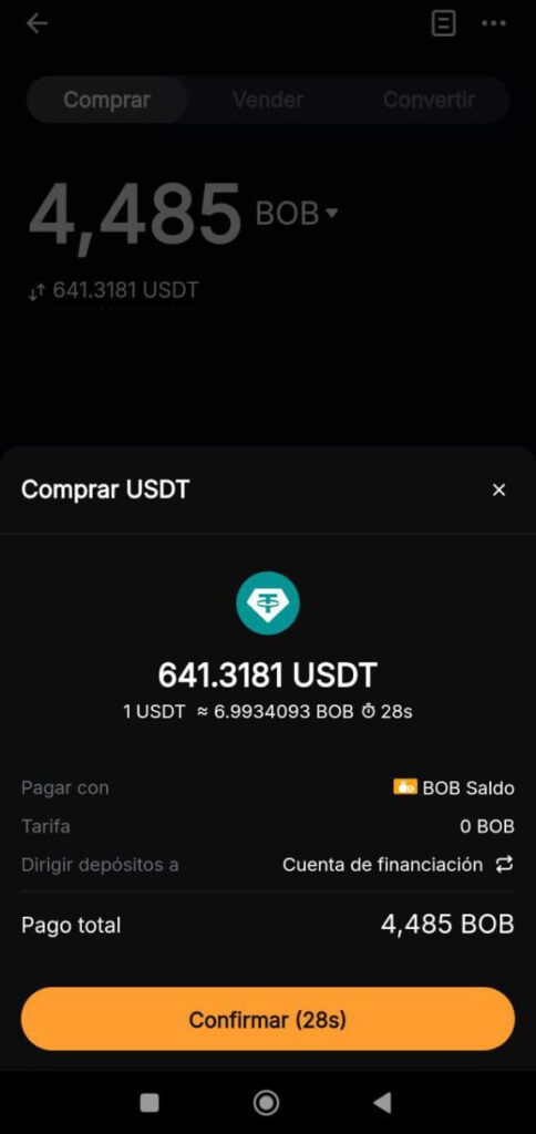 La siguiente imagen es de otra captura muestra una compra posterior a 4.485 BOB por 641 USDT a 6,99 BOB, confirmando la consistencia de la tasa durante la ventana promocional.