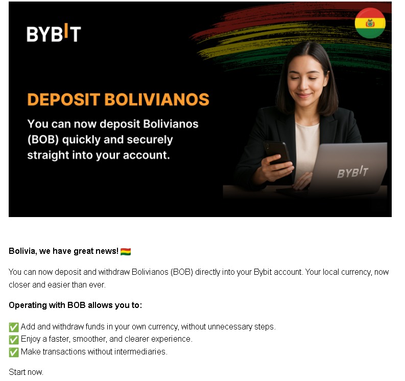 El detonante fue un correo electrónico masivo enviada por Bybit a usuarios bolivianos, anunciando la «habilitación de depósitos y retiros en BOB directamente en tu cuenta». La comunicación, con la bandera boliviana y un diseño festivo, prometía operaciones «sin intermediarios, más rápidas y claras que nunca».