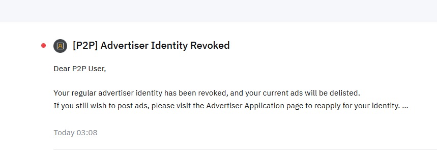 - Deshabilitación como comerciante en P2P revocando la identidad. (Ver siguiente imagen)